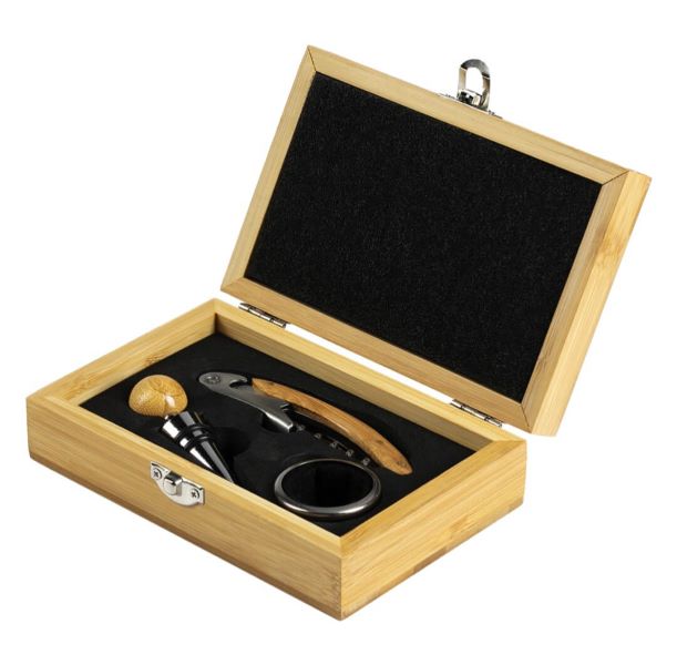 Vinski set u drvenoj kutiji je originalan poklon za sve ljubitelje vina. Ukoliko još na to dodate neku lepu poruku izdvojićete se u moru poklona, a vaša personalizovana kutija će zauzeti posebno mesto u kućnom baru. Set sadrži otvarač za flašu, zatvarač flaše i prsten protiv podlivanja.
